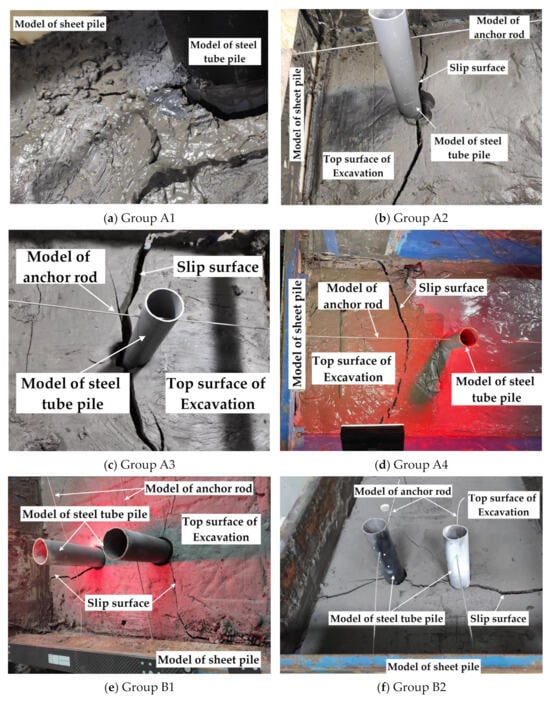 When the distance between them was 10 cm (Figure 10a), although a visible through-slip failure surface did not manifest, significant deformation of both the sheet pile and pipe pile occurred. The failure surface was located on the outer side of the pipe pile. As the spacing increased to 30 cm (Figure 10b) and 50 cm (Figure 10c), a through-slip failure surface became evident near the pipe pile’s vicinity, indicating that the pipe pile’s deformation induced the formation of a localized plastic zone in the soil between the piles, eventually leading to the development of a through-slip failure surface. When the spacing reached 100 cm (Figure 10d), the through-slip failure surface appeared between the sheet pile and the pipe pile, approximately 0.7 to 0.8 m away from the sheet pile. Notably, this distance closely aligned with the width of the Rankine active soil pressure zone behind the sheet pile. In Group B (employing double tubular piles), the overall failure pattern resembled that of Group A tests, where tubular piles and sheet piles shared identical spacing configurations.