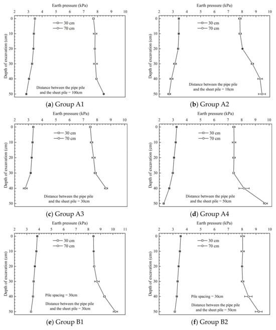 At a depth of 0.3 m, situated within the excavation depth range, the initial earth pressure value closely resembles the statically calculated earth pressure value according to Rankine’s theory. As the excavation depth increases, the earth pressure value decreases, corresponding to the transition from static earth pressure prior to excavation to active earth pressure post-excavation. During the excavation, the measured earth pressures were less than those calculated using the Rankine earth pressures, which is consistent with the results from reference [17]. Conversely, at a depth of 0.7 m, positioned below the excavation depth range, the initial earth pressure value also approximates the statically calculated earth pressure value. However, as the excavation depth increases, the earth pressure value rises, primarily attributed to the relatively low stiffness of the sheet piles and the vertical bending deformation exerted on the soil.