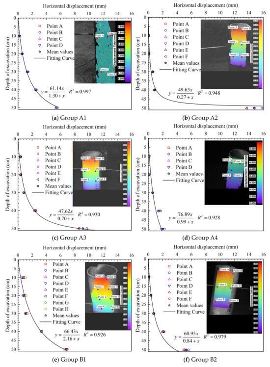 The displacement at the top of the pile increases gradually as excavation deepens. Initially, with a shallow excavation depth, the displacement shows almost linear progression. Subsequently, despite a sudden change in horizontal displacement, there is still a certain level of bearing capacity and deformation resistance. This behavior generally follows the hyperbolic rule of change, with a correlation coefficient (R2) exceeding 0.9. The fitting parameters in the numerator of the hyperbolic equation represent the limit excavation depth, while those in the denominator indicate the rate of hyperbolic convergence towards the asymptote.