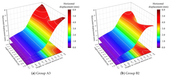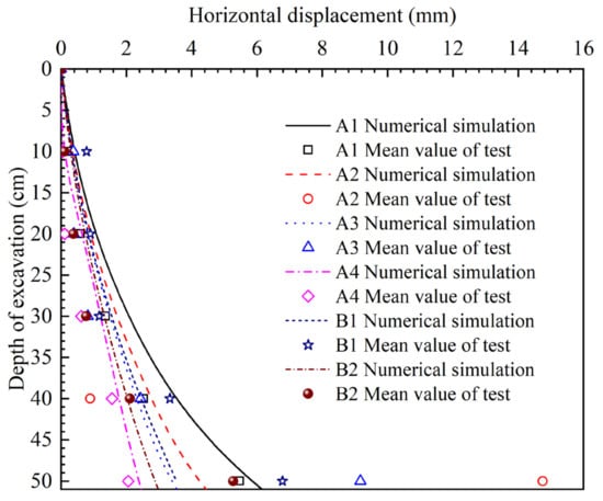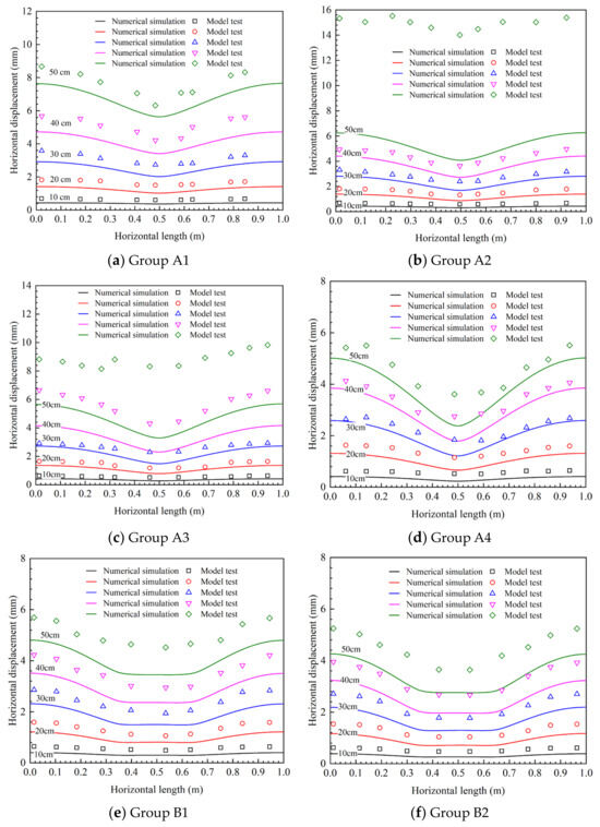 Figure 15 presents the comparison between the implemented values of horizontal displacement at the top of the sheet pile in each group of model tests and the numerical simulation. The test outcomes reveal a gradual increase in horizontal displacement of the top of the sheet pile with the deepening of excavation. In Group A (single pipe pile), the displacement values are distributed approximately symmetrically in the horizontal direction, with the centerline of the tie rod serving as the axis of symmetry. Furthermore, displacement magnitudes increase further away from the tie rod, forming a “V” distribution pattern that becomes more pronounced with increasing excavation depth. On the other hand, in Group B (double pipe pile), the displacement values are symmetrically distributed, with the centerline of two tie rods acting as the axis of symmetry.