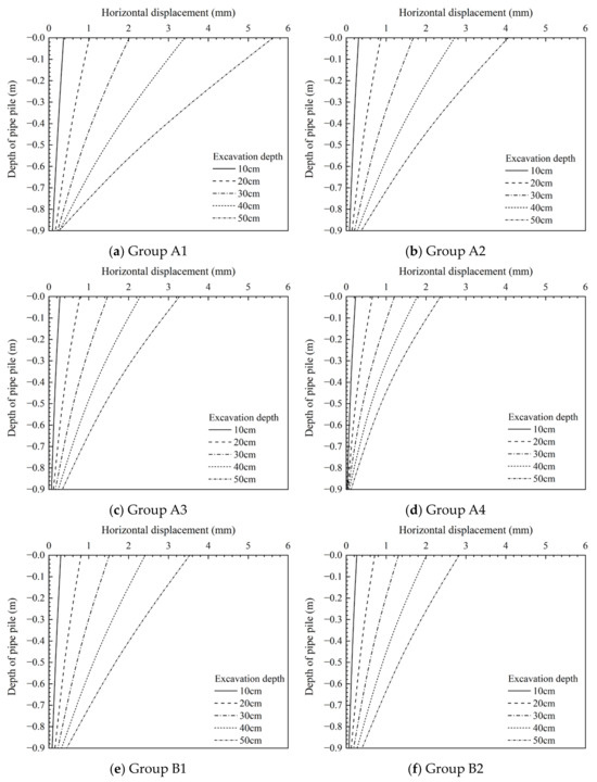 Figure 14 gives the overall horizontal displacement curves of each group of test piles obtained by numerical simulation. It is evident that the maximum displacement of the pile occurs at the top and gradually decreases towards the bottom. With increasing excavation depth, the pipe pile bends, and the bending position is correlated with the excavation depth. The minimum displacement is observed at the bottom of tubular piles, with overall variation being minimal, particularly when there is a large spacing between tubular piles and sheet piles. Additionally, it is noticeable that Groups B1 and B2 (double tubular piles) exhibit slightly smaller overall displacement compared to Group A2 and A3 (single tubular piles) with identical spacing of tubular piles and sheet piles. This suggests that specifications such as length, stiffness, and spacing of tubular piles also impact the stability of the support system.