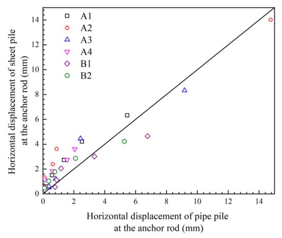 As depicted in Figure 17, the horizontal displacements at the tie rods of pipe piles and sheet piles in each group are summarized to generate a comparative diagram. The correlation coefficient between the horizontal displacements of pipe piles and sheet piles is calculated to be 0.96, indicating a significant correlation.