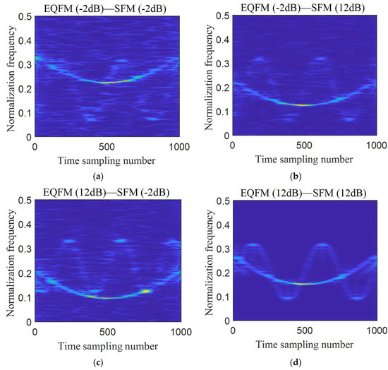 SPWVD transformation of four types of dual-component signals under different SNRs. (a). EQFM (−2 dB)-SFM (−2 dB); (b) EQFM (−2 dB)-SFM (12 dB); (c) EQFM (12 dB)-SFM (−2 dB); (d) EQFM (12 dB)-SFM (12 dB).