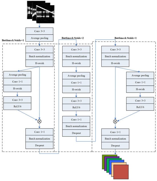 Figure 3 demonstrates that the designed CNN includes the following: the initial fully convolutional layer; an average pooling layer; two bottleneck convolutional blocks, where the expansion ratio is 1, and the stride length is 1; and a bottleneck convolution block, where the expansion ratio is 6, and the stride length is 2. Within this, the bottleneck convolution block with a stride length of 1 contains the following: a convolutional layer, a batch normalization, an activation function H-swish, an average pooling layer in which a kernel size is 2 × 2 and a stride length is 2, a convolutional layer in which the kernel size is 1 × 1 and the stride length is 1, an activation function H-swish, a depthwise convolutional layer in which t the kernel size is 3 × 3 and the stride length is 2, an activation function ReLU6, a convolutional layer in which the kernel size is 1 × 1 and the stride length is 2, a batch normalization, and a dropout. Finally, a residual connection is utilized. The expansion ratio of the bottleneck convolution block is set as 1. The bottleneck convolution block with a stride length of 2 is the same as the one with a stride length of 1, except that there is no residual connection.
