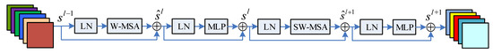 where and represent the outputs of W-MSA and MLP. In W-MSA, the input is a patches sequence, .