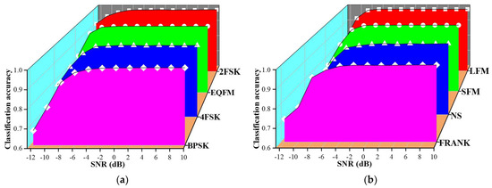 Figure 6 demonstrates that the recognition accuracies of eight types of signals increase with increasing SNR, while the increasing trend levels off at the higher SNR. It means that the lower SNR exerts an important effect on recognition accuracy. Moreover, 2FSK and LFM demonstrate a superior recognition performance over the others. That is because the clearer the TFIs for 2FSK and LFM are, the easier the detailed features are extracted, and the better the recognition performance which can be obtained. The recognition accuracies of 2FSK, EQFM, 4FSK, BPSK, LFM, SFM, NS, and FRANK are 90.83%, 82.14%, 77.98%, 67.62%, 80.71%, 75.95%, 73.45%, and 71.91%, at SNR of −10 dB, respectively. Moreover, the recognition accuracies of all types of radar signals are basically up to 1 at larger than 0 dB. Therefore, the designed CNN-ST model demonstrates better recognition performance at the same SNR.