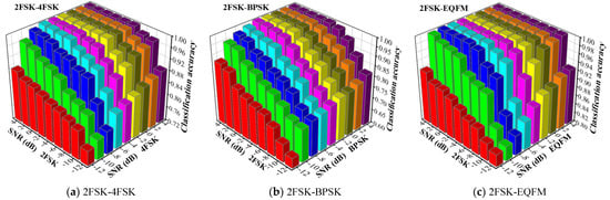 To investigate the influence of different SNRs on the recognition accuracy of dual-component signals, Figure 7 demonstrates the recognition accuracy as a function of different SNRs. Therein, the SNR is −12 dB to 4 dB; the X and Y axes represent the SNR under different radar signals; and the Z axis represents the classification accuracy. The dual-component radar signals include the following: overlapping 2FSK and 4FSK (2FSK-4FSK), overlapping 2FSK and BPSK (2FSK-BPSK), overlapping 2FSK and EQFM (2FSK-EQFM), overlapping 2FSK and FRANK (2FSK-FRANK), overlapping 2FSK and LFM (2FSK-LFM), overlapping 2FSK and NS (2FSK-NS), overlapping 2FSK and SFM (2FSK-SFM), overlapping LFM and 4FSK (LFM-4FSK), overlapping LFM and BPSK (LFM-BPSK), overlapping LFM and EQFM (LFM-EQFM), overlapping LFM and FRANK (LFM-FRANK), and overlapping LFM and SFM (LFM-SFM).