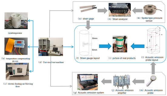 The granite was initially heated in an electric blast drying oven at a constant temperature for 24 h. Subsequently, it was removed from the oven, wrapped in a vinyl shell, and equipped with a temperature compensation device to maintain a steady temperature. Following the temperature stabilization process, a uniaxial loading test was conducted. Simultaneously, the damage progression of the rock under loading was monitored using a strain analyzer and an acoustic emission meter. The acoustic emission meter utilized six probes arranged diagonally above and below the specimen, positioned 20 mm from the top and bottom ends of the rock. The top three probes were uniformly placed at angles of 0°, 90°, and 180°, mirroring the arrangement at the bottom end (Figure 1i). Petroleum jelly was selected as the coupling agent to minimize reflection loss and friction between the probe surface and the rock. During testing, both the acoustic emission threshold and gain were set to 40 dB. The localization settings included an overdetermination value of 20, an event definition value of 200, and a time-locked value of 400 µs. The specific test steps are depicted in Figure 1.