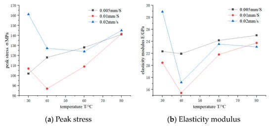 The variations in the peak stress and elastic modulus of the rock can provide insights into its bearing capacity and deformation capacity to some extent. The test results illustrating these findings are presented in Figure 2.