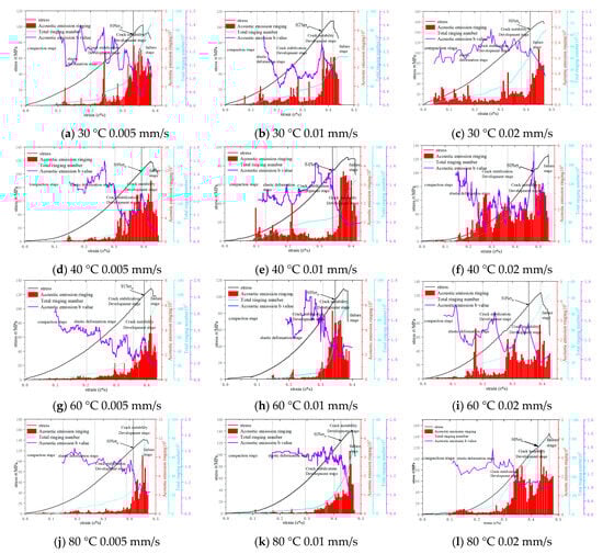 To some degree, acoustic emission ringing and energy provide insights into the extent of crack development in rock at specific stages, while the b-value predicts rock damage. However, these metrics do not comprehensively represent the crack development trends, energy magnitudes, and resultant damage across different locations. To delve deeper into the crack development and evolution patterns of granite under varying temperatures and loading rates, we further analyzed the crack development process. This analysis combines the ratio of acoustic emission damage and energy with the distribution of acoustic emission signal points at each stage of the granite loading process.