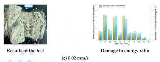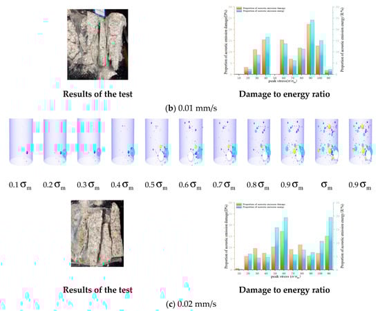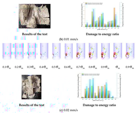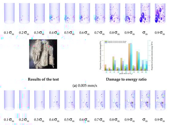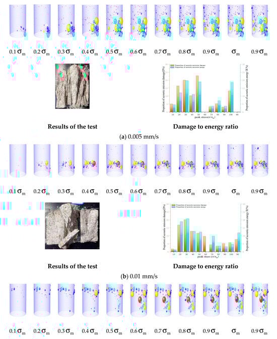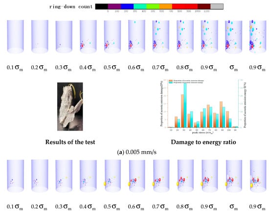 Figure 5 reveals that at 40 °C, the acoustic emission signals under loading rates of 0.005 mm/s and 0.01 mm/s initially concentrate centrally in the lower right corner of the specimen. Conversely, under a loading rate of 0.02 mm/s, these signals first emerge at the upper end of the specimen before gradually propagating toward the inner part, with their number and energy intensifying while the density strengthens. Concurrently, at the same stress level of the specimen, both the quantity and energy of the acoustic emission signals increase under a loading rate of 0.02 mm/s, resulting in the most severe damage to the specimen. The ultimate damage pattern observed in the compression test of the specimen further corroborates the accuracy of the acoustic emission development process. Regarding the distribution of damage and energy percentages under each loading rate, the trends in the acoustic emission energy and damage percentages mirror those observed at 30 °C and do not necessitate repetition.