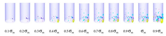 By applying the aforementioned analytical methods to scrutinize the acoustic emission spatial signal point variation pattern of granite at each stress stage, we obtained the acoustic emission spatial signal point evolution process of granite specimens at each stress stage under various temperatures and loading rates. These findings are illustrated in Figure 4, Figure 5, Figure 6 and Figure 7.