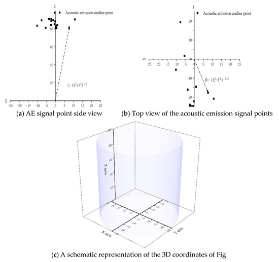 The projection of acoustic emission signal points onto the top (XOY plane) and side (XOZ plane) views involves measuring the distance, L, from the coordinate to the origin on the side view, indicating the signal point’s proximity to the lower end of the rock specimen. Similarly, the distance, R, from the coordinate to the origin on the top view indicates the distance from the center of the test specimen. Here, the X- and Y-axes are situated on the bottom surface of the cylinder, with the origin of the XOY plane located at the center of the cylinder’s bottom surface and the Z-axis running parallel to the cylinder’s axis and extending upward from the base.