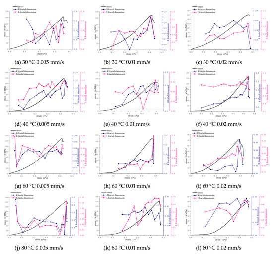 Figure 9 shows that the fractal dimension fluctuates under different loading rates and temperatures, and the fractal dimension generally decreases, then fluctuates, and then decreases. The stages of decreasing fractal dimension in the granite specimens are the compaction stage and the destruction stage. This is attributed to the closure of internal pores during the rock compaction stage, leading to a reduction in fractal dimension. Subsequently, in the rock damage stage, as the main cracks penetrate through, the fractal dimension further decreases. Moreover, with increasing temperature, the magnitude of change in the fractal dimension during the destruction stage increases. The fractal dimension fluctuation stage includes the elastic deformation stage, stable crack development stage, and unstable crack development stage. During this stage, the crack initiation, expansion, or closure of the rock specimen, and orderly, disorderly changes of the cracks occur. This is an overall change in the direction of increasing order; thus, the fractal dimension fluctuation changes, and the amplitude of the overall crack development increases. Under identical temperature conditions, an increase in the loading rate results in a decrease in the magnitude of the fractal dimension within the range of 0.1–0.7. Specifically, a higher loading rate correlates with a lower degree of compactness in the granite specimens. The fluctuations in fractal dimension occur within the range of 0.02–0.52, transitioning between 0.15–0.52 with increasing loading rates, then to 0.1–0.3, further transforming to 0.002––0.320, and subsequently to 0.002–0.520. Notably, the fractal fluctuation between 0.002–0.212 significantly diminishes, indicating a reduction in cracks within the specimen during compression. At constant loading rates, as the temperature increases, the fractal dimension decreases within the range of 0.1–0.4, signifying stages of specimen compression density and crack distribution during the damage stage. Additionally, the amplitude of fractal dimension fluctuations increases from 0.05–0.52 at temperatures of 30 °C and 40 °C to 0.1–0.3 at temperatures of 60 °C and 80 °C. The amplitude of the change in amplitude decreases, indicating that the greater the temperature of the crack development process is, the greater the crack distribution, and the greater the temperature is, the greater the crack distribution. In the development process, with a more decentralized crack distribution, cracks cannot form in an obvious direction, and the cracks clearly form a network.