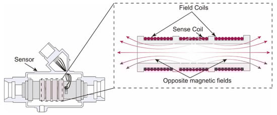 As Figure 1 shows, two field coils form part of resonant circuit and are supplied with a high frequency AC voltage that induces the opposite magnetic fields, which are balanced at the midpoint between the coils, that is, the sensing coil. The resonant circuit enables significantly greater sensitivity to a passing metallic particle. The passage of the metallic particle causes a characteristic signature, whose amplitude and phase are utilized to obtain the information of the passed particle [,].