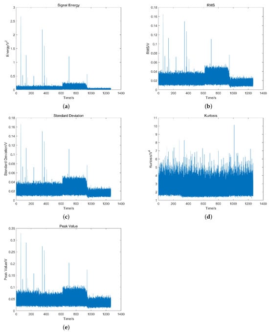 Results of different time domain indices: (a) energy, (b) RMS, (c) standard deviation, (d) kurtosis, and (e) peak value.