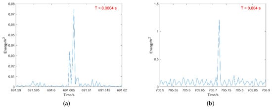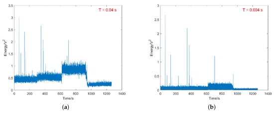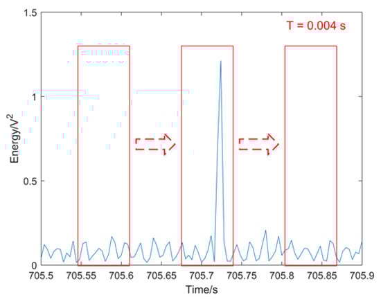 To verify the impact of the time interval on time domain analysis, set and , the time domain index still has energy. The comparison is illustrated in Figure 6 and Figure 7. Conclusions can be drawn that there are disadvantages when the time interval is too large or too small. If the time interval is excessively large, the difference between debris signature and noise signature will be reduced, and the background can be affected by the working conditions. If the time interval is excessively small, a complete debris signature may be split into several parts, which introduces unnecessary troubles in debris signature detection. Therefore, it is reasonable to set the time interval as the time span of the debris characteristic signature.
