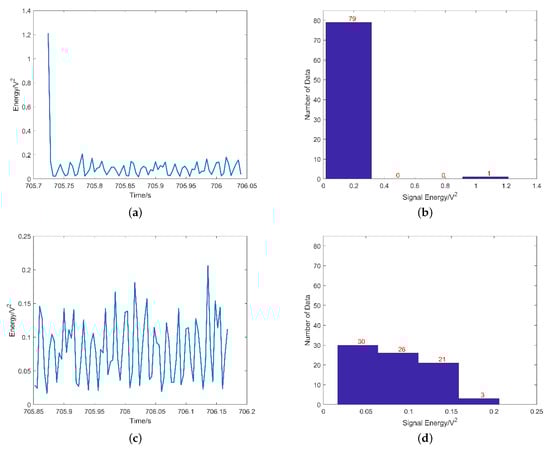The data distribution of the typical debris signature and noise signature are illustrated in Figure 9. For the debris signature, the histogram shows an unusual distribution, only a few data fall into the highest bin, while most of the data are concentrated into the lowest bin, and there are several blank bins in the middle. In sharp contrast to the debris signature, the histogram of the noise signature is more even. The reason is that the energy value is extremely high when the debris signature falls into the sliding window, and the upper boundary is the maximum value of the data in this sliding window. Therefore, the upper boundary can be extremely high when the debris signature is included in the sliding window, which results in the concentration of the data being in the lowest bin and the blank in the middle bins.