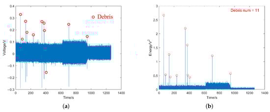 In order to further verify the debris signature detection capability of this method, the oil debris simulation experiment in the laboratory is also carried out. The raw monitoring signal is illustrated as Figure 11a, the energy value signal is obtained through the time domain analysis, illustrated as Figure 11b. As illustrated in Figure 12, the data distribution of the debris signature and noise signature differs a lot. Furthermore, finally, the debris signature is identified as illustrated in Figure 13.