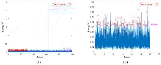 To some extent, the debris detection is similar to the outlier detection, in which the energy value of the debris signature is the “outlier” should be detected. For comparison, a common outlier detection method, 3, is also applied on the same energy value signal, and the detection results are illustrated in Figure 14, in which a large amount of the noise signature is mistaken for the debris signatures. Frankly, the amplitude of noise is indeed high, which has broken the threshold of 3 after all. However, it is still not as high as the amplitude of debris, which shows a sharp contrast in Figure 14a. This shows the advantages of the debris detection method proposed in this paper. The key to this method is the combination of the histogram characteristic with the conversion to a relative threshold from the absolute threshold, and therefore, it has a satisfactory performance in the inhibition of false alarms. Additionally, the detection performance is only related to the signal itself, and therefore, it is applicable for various sensing principles, including but not limited to the inductive sensor signal.