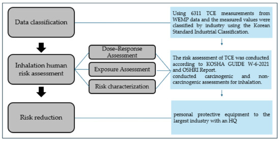 Figure 1 presents a diagram of methods. In total, 7046 TCE measurements were obtained from WEMP data. The industry classified the measured values using the Korean Standard Industrial Classification (KSIC 10th) [39]. Only industries with more than 30 measured values were chosen as research subjects to assume a log-normal distribution [40,41]. Excluding STEL measurements, this study used 6311 measurements in total. Of the 6311 classified data points for the 20 industries, 2923 measured values were 0. To avoid statistical underestimation, a measurement value of 0 was corrected to the detection limit/2 when calculating the mean (AM) and standard deviation (SD) [42]. The detection limit of TCE was determined by referring to the technical guidelines of the Korea Occupational Safety and Health Agency (KOSHA) to measure and analyze the work environment for TCE [43].