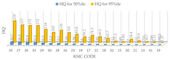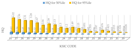 According to the non-carcinogenic risk assessment, the 95th percentile of HQ indicates high-concentration exposure, with 60% of the 20 manufacturing industries showing an unacceptable risk. The results of the carcinogenic risk assessment in this study showed that the HQ exceeded 1 in all industries at the 95th percentile, indicating exposure to high concentrations. Additionally, 85% of industries at the 50th percentile HQ, corresponding to average exposure, showed unacceptable risk.