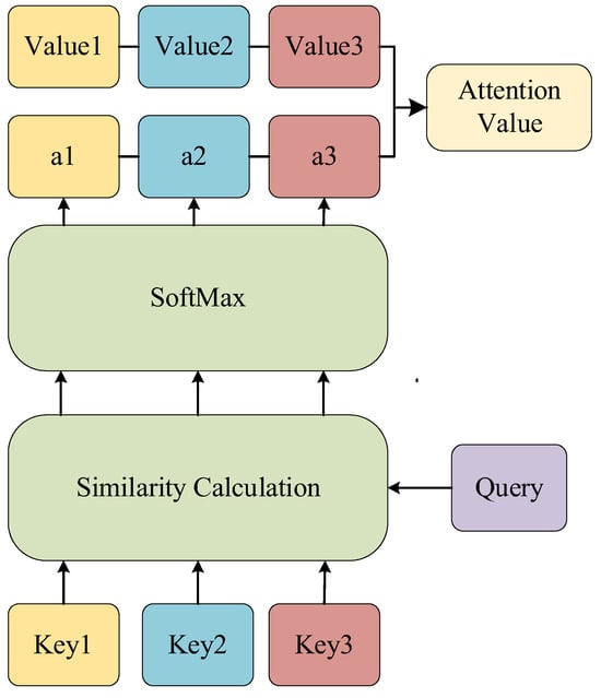 The attention mechanism achieves targeted focus and weight allocation of information through a mechanism called Query–Attention–Key. The core concept of this mechanism is to compute the relevance between a query and a set of keys and use this relevance to determine the weight distribution of the final output values. The computation process of the attention mechanism is illustrated in Figure 4. Specifically, it first computes the relevance between the query and each key using some calculation method (e.g., dot product). Then, it uses some normalization function (e.g., softmax function) to transform these relevances into a weight distribution, ensuring that the sum of all weights is 1. Finally, it uses these weight allocations to aggregate all values, generating the final output result.