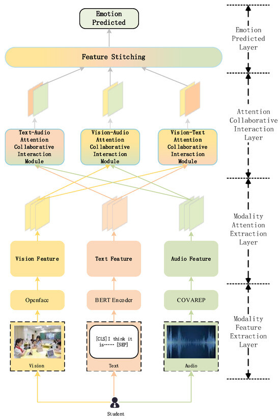There have been many research results on the extraction of emotional states, such as methods based on local information. Firstly, facial keypoints or key regions were manually selected and local features were then extracted for expression classification (Pantic et al., 2004 [5]; Bashyal et al., 2008 [6]; Cheon et al., 2009 [7]). Subspace feature extraction methods, focusing on the overall facial features, were employed to obtain the optimal transformation under certain criteria, projecting high-dimensional data into a low-dimensional space, retaining only discriminative features for facial expression classification in the subspace, thereby achieving the goal of dimensionality reduction, correlation elimination, and improved classification performance (Shan et al., 2006). However, traditional emotion-recognition models mainly have relied on unimodal data, such as text or speech [8]. While this unimodal approach can provide useful emotion-recognition results in specific contexts, the accuracy of recognition results is not high. Unimodal emotion-recognition models often struggle to fully capture and understand students’ emotional states. This is because emotional expression in students’ learning processes is multidimensional, including language, tone of voice, facial expressions, and even body posture [9], These multimodal pieces of information collectively provide a more comprehensive reflection of individuals’ emotional states. Therefore, through employing multimodal emotion recognition models, it is possible to significantly enrich the dimensions of educational assessment, enhance the quality and effectiveness of education and teaching, and achieve a more humane and intelligent educational environment.