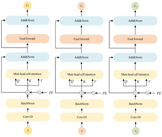 Next, we calculated positional embeddings for each position index in the sequence. Assuming the specific process followed Equations (4)–(6), the next step involved extracting self-attention mechanisms between the features of different modalities. This study utilized the superior performance of sine-based positional embedding functions as the positional encoding mechanism in the sequence model: