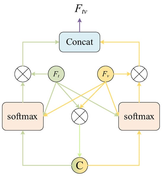 Then, we normalized the bidirectional attention weights for text and visual features using the softmax function to obtain attention weights and . This step allowed the network to focus attention on important feature information, thus improving feature representation. The specific formulas are shown in Equations (17) and (18), where , is a learnable weight matrix.