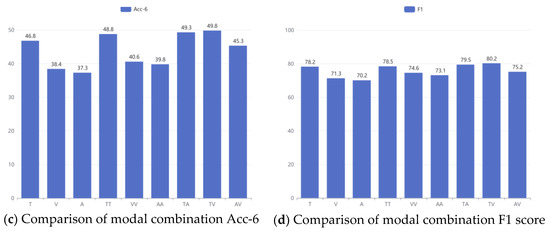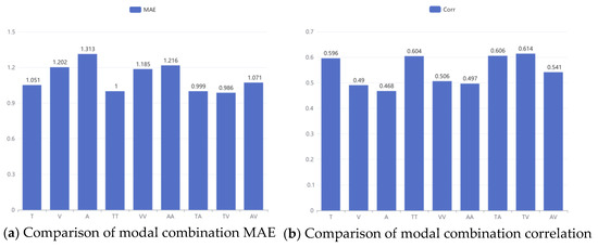 Additionally, this section also explores the complementarity between modalities, denoted by TA, TV, and VA, representing scenarios where two different types of modality data were fused through a cooperative attention module before predictions were made. Subsequently, the mean absolute error (MAE), correlation (Corr), accuracy (Acc), and F1 score were tested for each of nine scenarios. The specific experimental results are displayed in Figure 8.