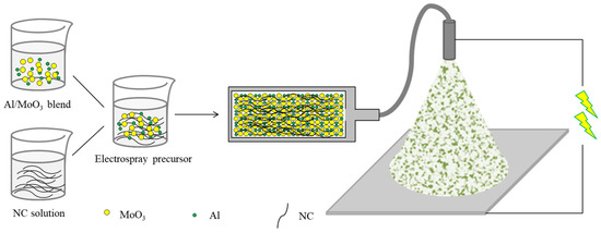 Diagram of the electrospray fabrication of Al/MoO3 nanothermite.