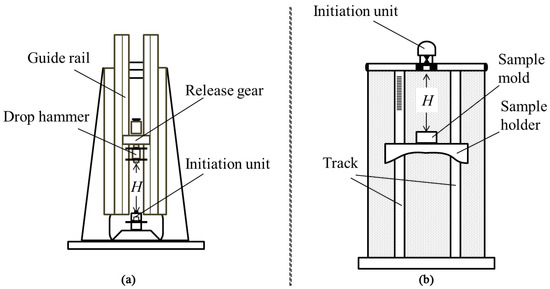 The impact sensitivities of the samples were acquired by the drop-weight impact test. In a typical test, a weight of 1.2 kg was dropped from a predefined height onto a striker plate. The next height was determined by the result of the last test: if a reaction happened in the last test, the next height would be decreased, otherwise it would be increased. A sequence of tests were conducted until the sensitivity index, H50, was acquired [36]. Here, the H50 was the height at which a given weight dropped onto the sample produced a reaction of 50% of the test trails. The diagram of the test equipment is shown in Figure 2a.