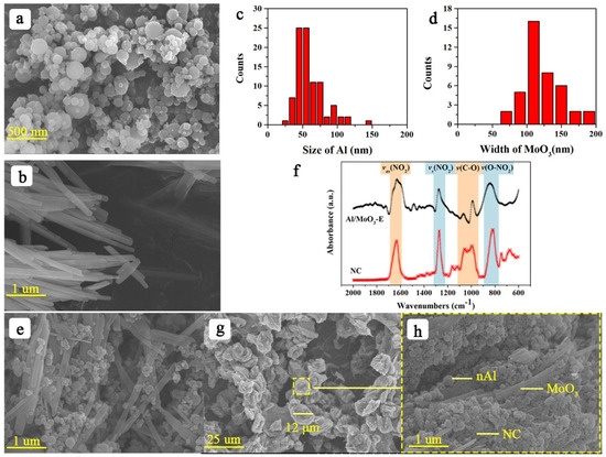 (a,b) SEM images of Al nanoparticles and MoO3 nanostrips, respectively; (c,d) size distribution of (a,b), respectively; (e) SEM image of mechanically mixed Al/MoO3-M; (f) FTIR spectra of NC and the electrosprayed Al/MoO3; (g,h) SEM images of Al/MoO3-E.
