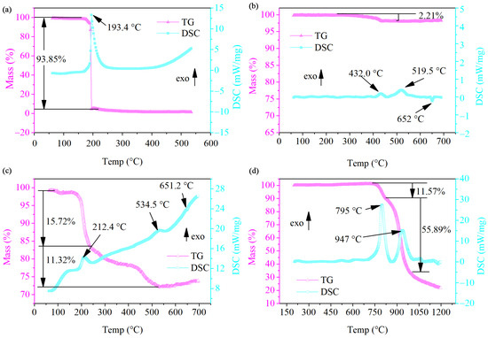 Thermal DSC and TG curves of the samples at a heating rate of 20 °C·min−1 within an argon atmosphere: (a) NC; (b) Al/MoO3-M; (c) Al/MoO3-E; (d) MoO3 nanostrips (in each figure, “exo” is short for “exothermic”, and the upward vertical arrow alongside “exo” indicates that the upward peaks in DSC curves are the exothermic peaks).