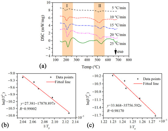In the equation, β is the heating rate, K·min−1; Tp is the peak temperature of the exothermic peak in the DSC curve, K; R is the universal gas constant, 8.314 J·mol−1·K−1; A is pre-exponential factor, s−1; and Ea is the activation energy, kJ·mol−1.