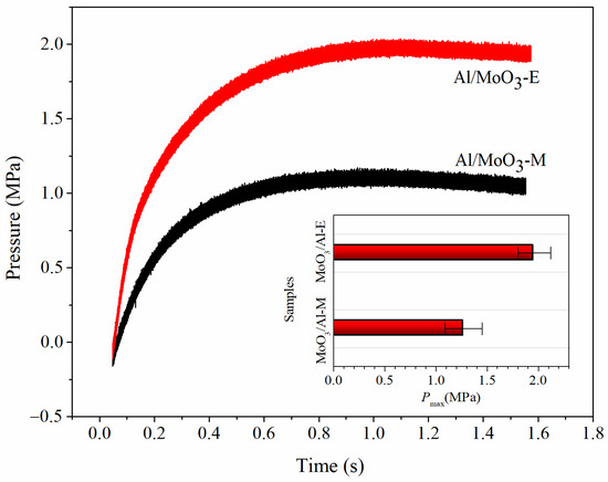 Typical P–t curves of Al/MoO3-E and Al/MoO3-M (insert: comparison of the mean maximum pressure for each sample).