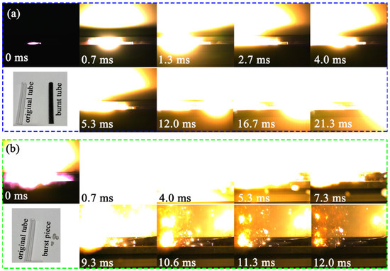 The combustion performance of Al/MoO3-E particles was characterized under confined and unconfined conditions, respectively. For comparison, the combustion performance of Al/MoO3-M particles were also conducted under the same conditions. The combustion results under confined and unconfined conditions are displayed in Figure 8 and Figure 9, respectively. For all tests, the combustion sequences were relative to the ignition time; therefore, the moment of ignition was set to 0 ms. In the case of combustion under confined conditions (samples inside the PMMA tube), the situations of the two samples were completely different from each other. For Al/MoO3-M particles, it took 12.0 ms to finish the combustion throughout the tube (Figure 8a). And compared with the original PMMA tube, the tube that went through combustion remained intact but was burned to black. On the contrary, in the case of Al/MoO3-E, the fierce combustion immediately started after ignition. It took merely 0.7 ms for the combustion of Al/MoO3-E particles to be completed throughout the tube (Figure 8b). At that time, the shooting area was suddenly filled with bright light. After the fade of the combustion light, it could be identified that the tube burst into pieces and the ruler next to the tube also fell down. Moreover, there were sparks in the surrounding area from 10.6 ms to 12.0 ms, which indicated the burst reaction of Al/MoO3-E. The inserted photo in Figure 8b displays the tube pieces shattered by the fierce combustion.