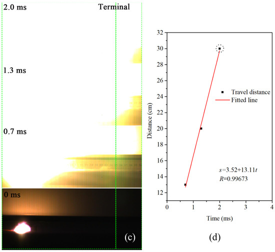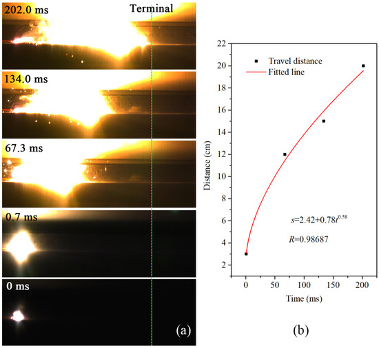 To avoid the fierce burst phenomenon, the combustion velocities of the samples were measured in open air. For each test, 0.2 g of the sample was loosely placed on the surface of a flat slab in the shape of 20 cm × 5 cm × 0.5 cm. The sample was ignited by an electric igniter. The corresponding combustion results are shown in Figure 9. Figure 9a,c are the combustion photos of the samples, and their corresponding travel history curves are shown in Figure 9b,d, respectively. From Figure 9b, it could be seen that the travel distance of Al/MoO3-M increased exponentially with time, and it took 200 ms to complete the travel path. On the other hand, in the case of the electrosprayed counterpart, the travel distance linearly increased with time at a slope of 13.11, and it took less than 2 ms to finish traveling. Even under such unconfined condition, the combustion velocity of the electrosprayed sample was way ahead of the physically mixed sample. It could be inferred that it was the integrity of the structure rather than the confinement that influenced the reaction rate. With the addition of confinement, the combustion of the electrosprayed sample could turn into deflagration due to the rapid heat accumulation.