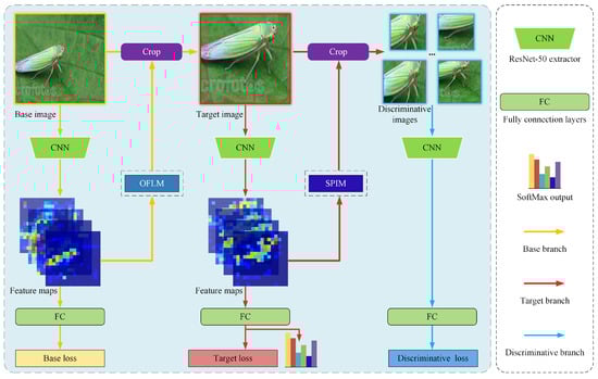 Our main task is executed using the DAM-Net, designed for fine-grained feature recognition of pests. Figure 2 outlines the composition of the DAM-Net, which includes a base branch, a target branch, and a discriminative branch. The base branch captures global features, providing a holistic image representation. The object focus location module (OFLM) synthesizes feature maps from the base branch to determine the target object’s bounding box, enabling cropping of the base image. This cropped image undergoes processing via the target branch to extract structural and fine-grained features. Complementing this, the specific part identification module (SPIM) isolates and crops the most discriminative and least redundant parts of the object. These regions are fed into the discriminative branch, which delves into intricate details across various scales. Equations (1)–(3) represent the loss functions for the three branches, respectively.