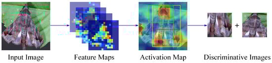 To overcome the challenge of the OFLM typically detecting incomplete sections of a target, we enhance our model’s robustness by introducing a SPIM and a discriminative branch. Analysis of the activation map A reveals that regions with higher activation values are often associated with crucial parts of the pest, like its head or tail. To capture these informative areas, we employ a sliding window technique that isolates windows containing critical information as discriminative images. This process is further refined by adopting a full CNN, reducing computational effort in a manner similar to how OverFeat [] processes feature maps. Subsequently, we perform channel-wise aggregation of the activation maps, , for each window and determined the mean activation value, following the procedure outlined in Equation (11):