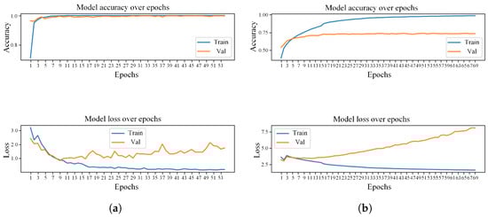 Training vs. validation accuracy and loss curves of the proposed framework. (a) Curves on D0 dataset. (b) Curves on IP102 dataset.