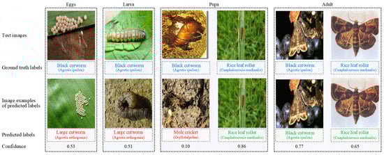 Our framework demonstrates superior performance on the D0 dataset, but faces challenges on the IP102 dataset due to the varied appearances of pests at different growth stages. This variability complicates classification, as species within the same genus can exhibit significant differences across stages, and unrelated species can appear similar at specific stages. To evaluate the framework’s robustness, Figure 8 displays instances of misclassifications, highlighting difficulties in pest recognition during the egg, larval, and pupal stages. These stages often lack distinct morphological features, leading to a homogenized appearance that confuses the framework. In contrast, adult pests develop unique features that aid correct recognition. However, the framework’s performance is also impacted by issues such as mislabeled categories and absent targets in the IP102 dataset images [,], as shown in Figure 6c.