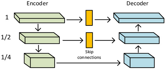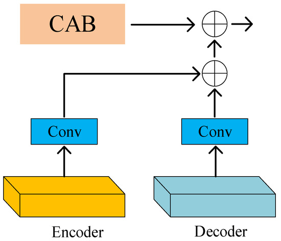 In our model, as shown in Figure 4, the Cross-Stage Feature Fusion (CSFF) module is introduced between the encoder and decoder. CSFF decreases the network’s information loss caused by repeated upsampling and downsampling operations in the encoder–decoder. In addition, features can be enriched. CSFF simplifies the information flow and makes the network optimization process more stable. Figure 5 shows the Channel Attention Block (CAB).
