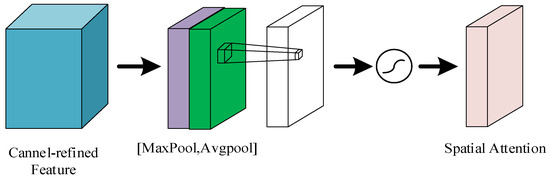 The spatial attention module can preserve the fine details from the input image to the output image, as shown in Figure 3. Firstly, the input feature map is subjected to maximum pooling and average pooling. Then, the results of maximum pooling and average pooling are spliced according to the channels. Finally, the spliced results are subjected to the convolution operation and then processed by the activation function to obtain the feature map outputted by the spatial attention mechanism; this suppresses the less informative features and enhances the extracted spatial features.
