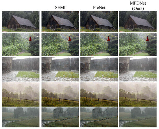 However, rainwater comes in a variety of forms and characteristics due to a number of factors such as shape, size, and wind speed. If the actual rain features do not match the model’s preset ones, the effectiveness of the model will be affected. Pairs of images with and without rain are difficult to obtain. Existing models are effective on synthetic datasets, but it is difficult to take paired no-rain and rain images in the real world, and there are still differences between synthetic rain maps compared to real rain maps. The generalization ability of the models needs to be improved. Currently, synthetic rain images are mainly used to train and evaluate the model; however, there are differences between synthetic rain images and real rain images. This may not be effective when dealing with irregular or dense rain in natural environments.