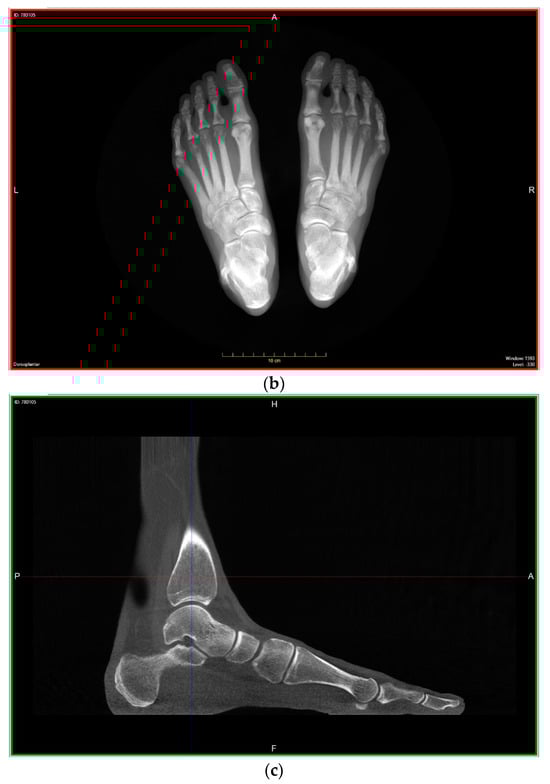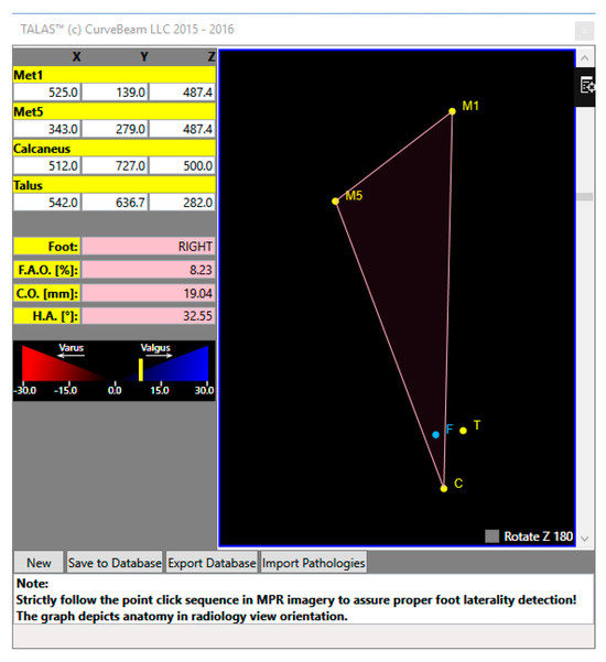 - Krähenbühl, N.; Kvarda, P.; Susdorf, R.; Burssens, A.; Ruiz, R.; Barg, A.; Hintermann, B. Assessment of Progressive Collapsing Foot Deformity Using Semiautomated 3D Measurements Derived from Weightbearing CT Scans. Foot Ankle Int. 2022, 43, 363–370. [Google Scholar] [CrossRef]