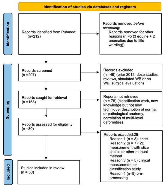A total of 212 studies were initially identified. Five references were excluded at this stage due to returning results clearly outside of the scope of the study such as equine standing CT. At the end of the selection process, 50 studies were included as reported in the dedicated PRISMA-compliant (Preferred Reporting Items for Systematic Reviews and Meta-Analysis) flow chart [42] (Figure 3). The median and mean sample size were 31 and 59 cases, respectively (range from 1 to 500 cases).