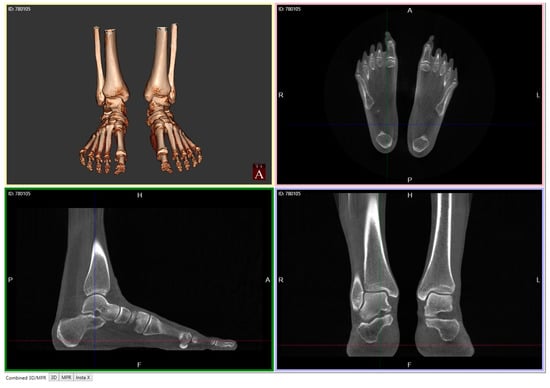 - Ortolani, M.; Leardini, A.; Pavani, C.; Scicolone, S.; Girolami, M.; Bevoni, R.; Lullini, G.; Durante, S.; Berti, L.; Belvedere, C. Angular and linear measurements of adult flexible flatfoot via weight-bearing CT scans and 3D bone reconstruction tools. Sci. Rep. 2021, 11, 16139. [Google Scholar] [CrossRef]