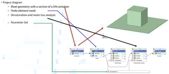 The CFD analysis was conducted in two phases, necessitated by the fluctuating output parameters during roasting and the model’s size (Figure 1). The 1st phase encompassed a steady-state analysis, yielding actual heat transfer coefficients on the surfaces of the goose fillet sample and the GN container. In the subsequent phase, the outcomes from the 1st stage were used in modeling the solids (goose sample and GN container), and transient simulations were executed to capture the temperature variations of the samples over time. The 1st stage focused on determining penetration coefficients, while the 2nd stage involved simulating protein denaturation and cooking loss.